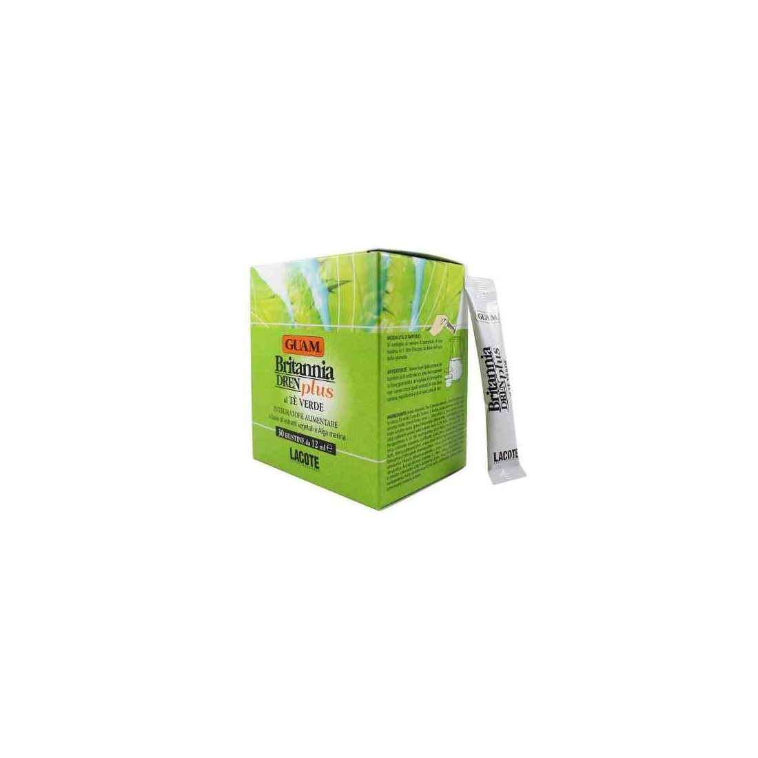 Guam Britannia dren plus favorisce il drenaggio dei liquidi corporei grazie all'azione diuretica e depurativa dei suoi principi attivi. Britannia Dren Plus è un integratore alimentare al gusto Tè verde, a base di estratti vegetali e Alga Marina. Associato all'utilizzo dei Fanghi d'Alga GUAM ne sinergizza l'azione.