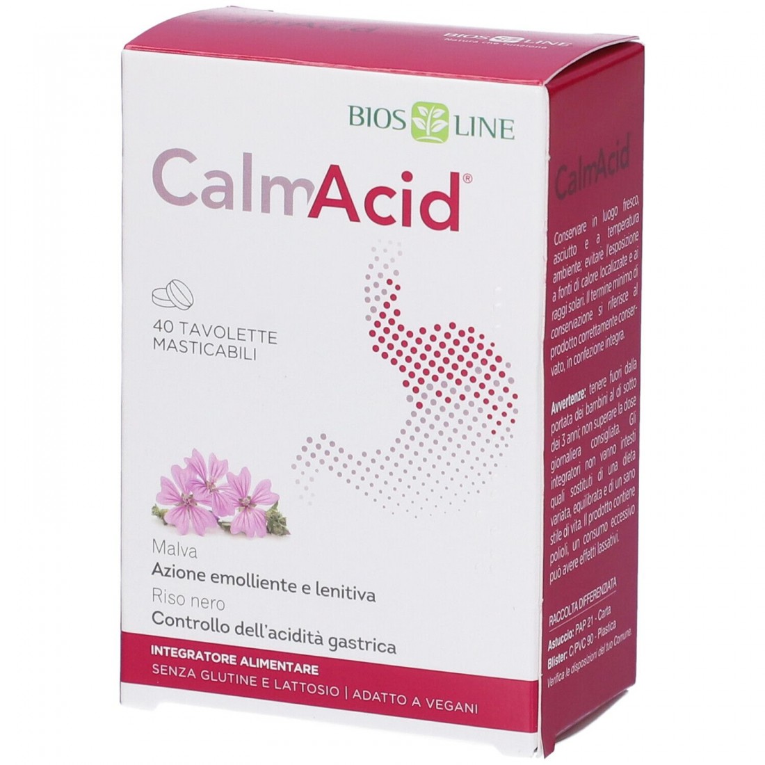 Bios line CalmAcid è un integratore alimentare a base di Calcio carbonato ed estratti di Riso nero, Camomilla e Malva. Il Riso è utile per il controllo dell'acidità gastrica e, insieme alla Camomilla e alla Malva, svolge un'azione emolliente e lenitiva sulla mucosa dello stomaco. Senza zuccheri (contenuto di zuccheri < 0,5 g/100g).