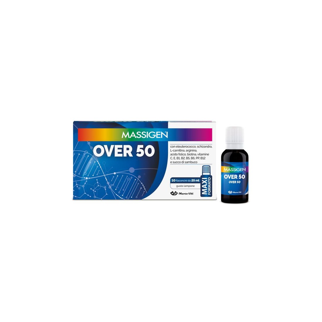 Massigen Over 60 contiene 10 flaconcini da 25 ml, gusto lampone.
