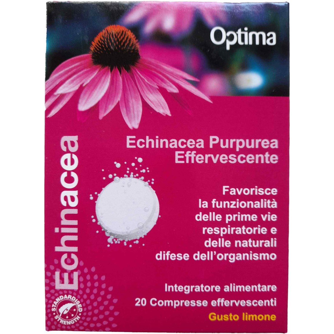 Optima Echinacea effervescente C è un integratore alimentare a base di estratto di echinacea purperea, vitamina C e zinco, utile per favorire le funzionalità delle prime vie respiratorie.