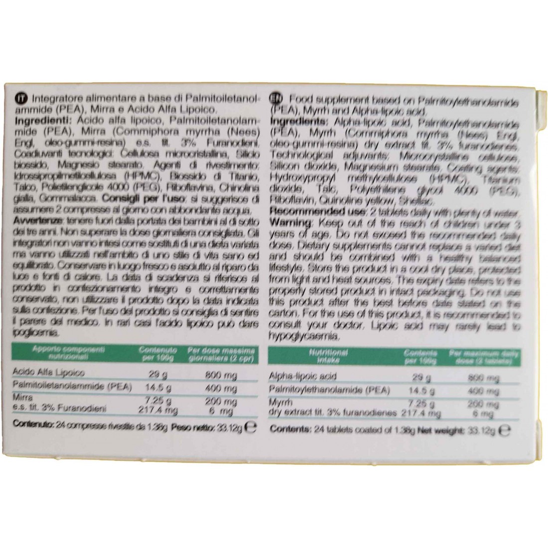 Acido alfa lipoico, Palmitoiletanolammide (PEA), Mirra (Commiphora myrrha (Nees) Engl, oleo-gummi-resina) e.s. tit. 3% Furanodieni. Coadiuvanti tecnologici: Cellulosa microcristallina, Silicio biossido, Magnesio stearato. Agenti di rivestimento: Idrossipropilmetilcellulosa (HPMC), Biossido di Titanio, Talco, Polietilenglicole 4000 (PEG), Riboflavina, Chinolina gialla, Gommalacca.