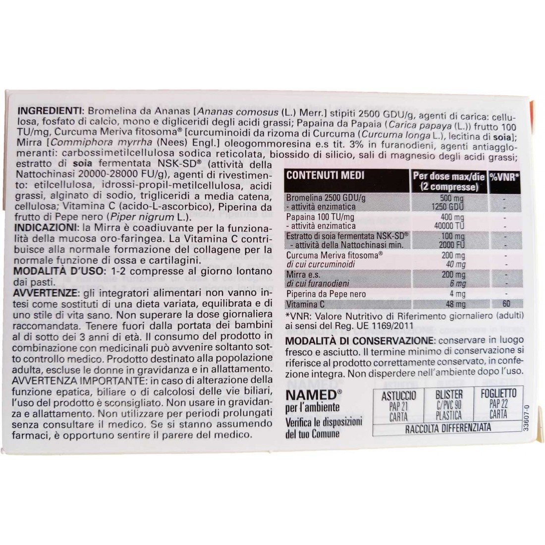 Named modulase è un integratore alimentare a base di Bromelina, Papaina, Estratto di Soia fermentata NSK-SD®, Curcuma fosfolipide Meriva®, Vitamina C, estratto di Mirra e Piperina da Pepe nero.