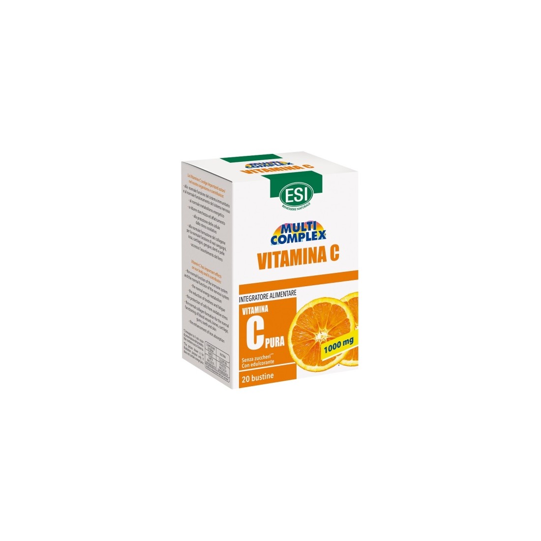 ESI multicomplex vitamina c contiene 20 bustine al gusto agrumi.