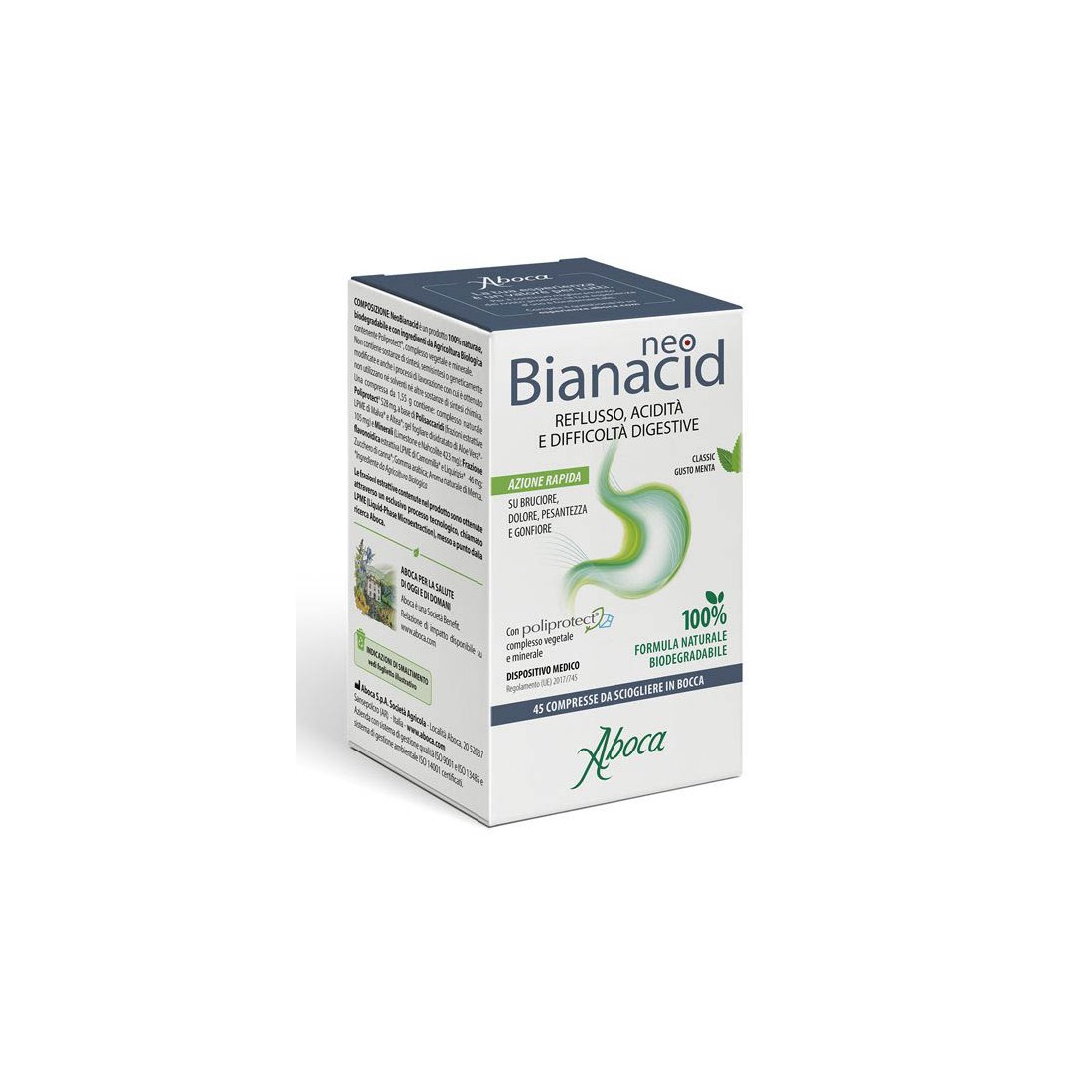 Aboca NeoBianacid è un prodotto a base di complessi molecolari vegetali e minerali, che svolge un'azione protettiva e, quindi, lenitiva della mucosa gastroesofagea utile per contrastare rapidamente il bruciore, il dolore, la sensazione di acidità, ovvero i sintomi tipici dell'irritazione e dell'infiammazione della mucosa stessa.