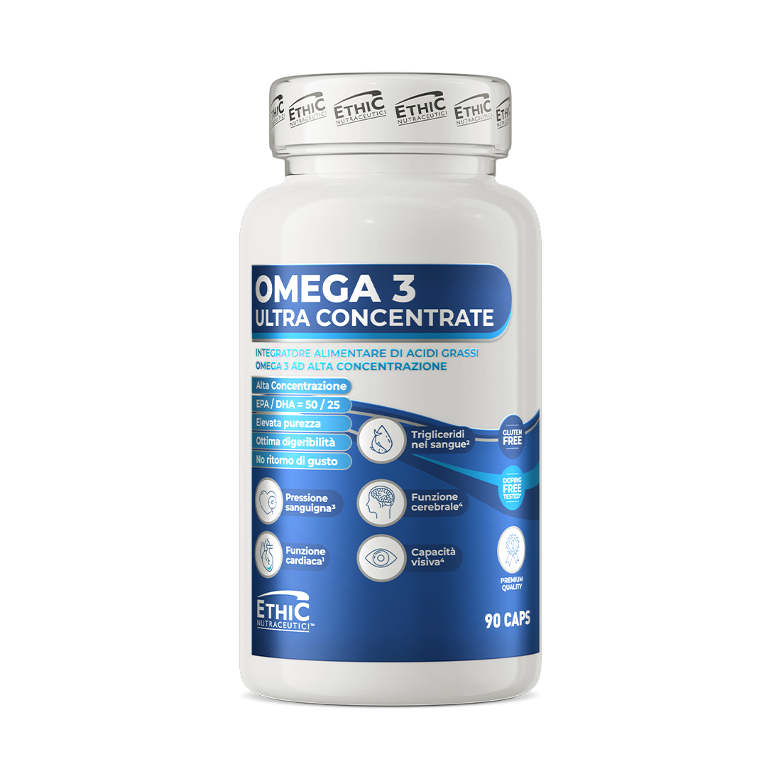 Ethicsport Omega 3 ad alta concentrazione, un sostegno completo al benessere di cuore, cervello, vista, trigliceridi e pressione.