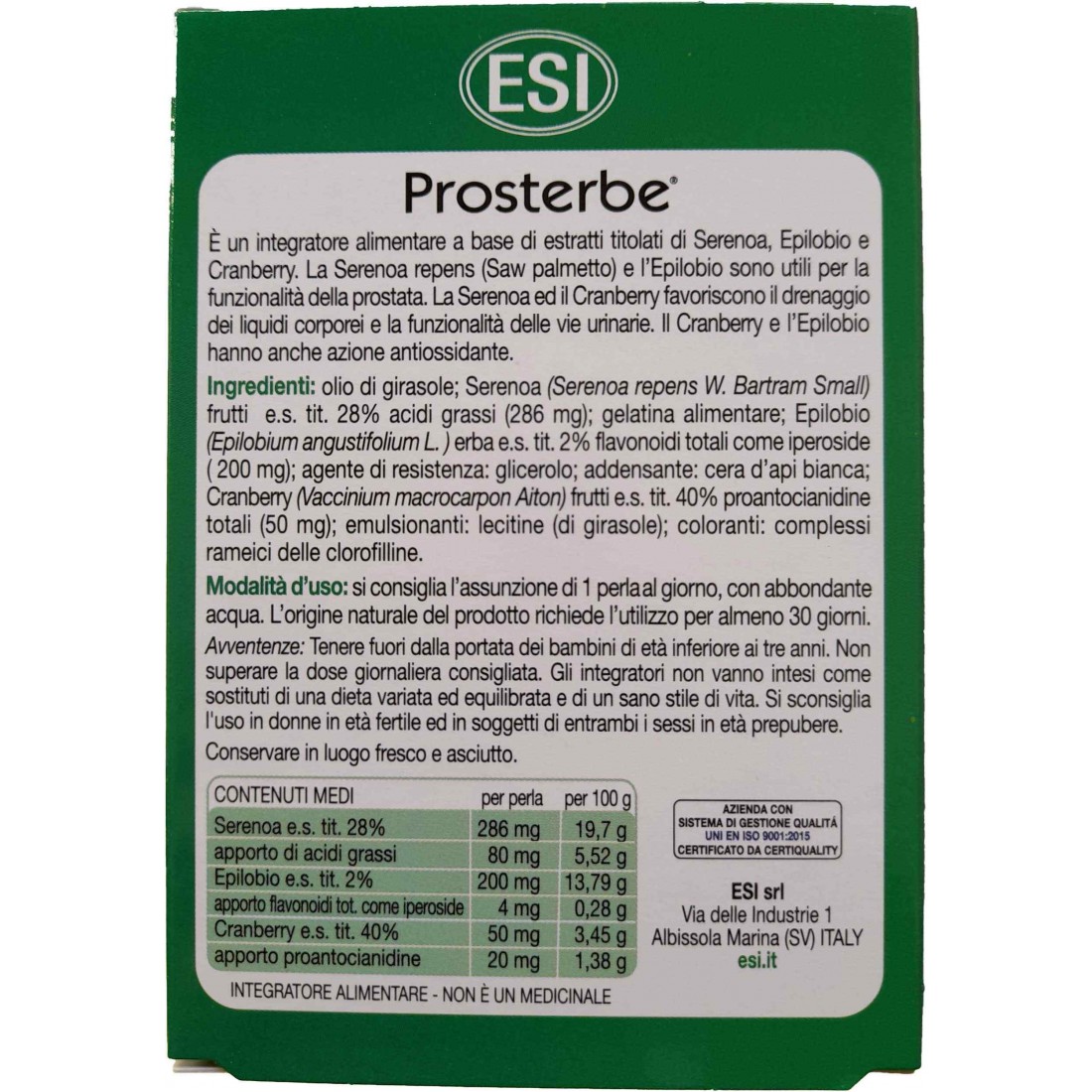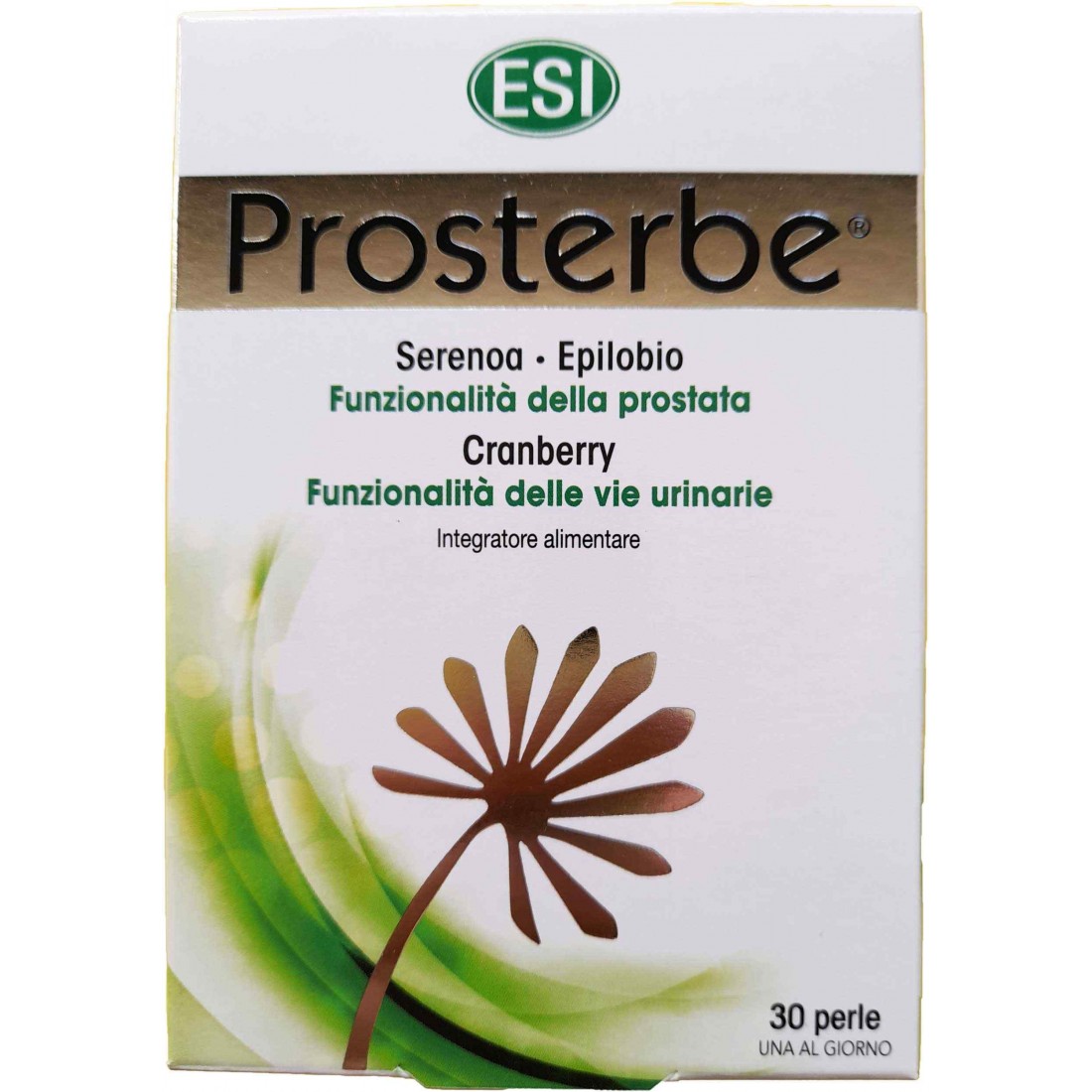 Esi Prosterbe è un un integratore naturale per le funzionalità della prostata e delle vie urinarie. Si tratta di un integratore alimentare ad azione drenante ed antiossidante, a base di estratti titolati di Serenoa, Epilobio e Cranberry in grado di rappresentare un valido complemento nel trattamento di disturbi e problematiche legate alle funzionalità della prostata e delle vie urinarie.