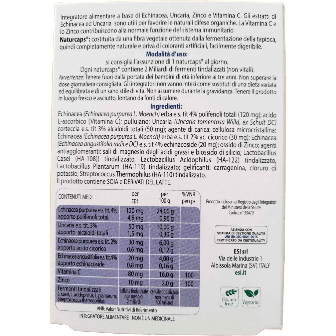 Esi Immunilflor 30 Naturcaps è un integratore alimentare utile per stimolare le difese immunitarie, a base di Echinacea, Uncaria, Zinco e Vitamina C. Gli estratti di Echinacea ed Uncaria sono utili per favorire le naturali difese organiche. La Vitamina C e lo Zinco contribuiscono alla normale funzione del sistema immunitario.